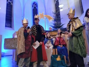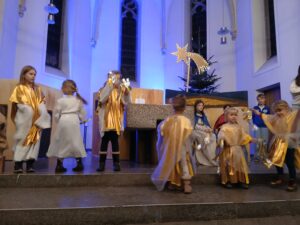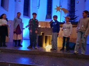 In 2025 haben 30 Kinder und Jugendliche zwischen 2 und 12 Jahren mitgespielt. Das klassische Krippenspiel wurde erweitert um drei Detektive, die den Sinn von Weihnachten ermittelt haben. Die Bilder sind einige Impressionen des geistreichen und gleichzeitig witzigen Stücks.