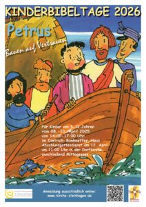 KiBiTa – Kinderbibeltage jährlich in der Woche nach Ostern von Mittwoch bis Freitag. Jedes Jahr laden wir gemeinsam mit der evangelischen Kirchengemeinde zu Kinderbibeltagen ein. Natürlich können Kinder aller Gemeinden teilnehmen.