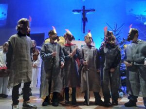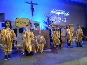 In Steinhagen findet dies um 16.00 Uhr in St. Hedwig statt. Das geht natürlich nicht ohne Mitspielerinnen und Mitspieler. Es gibt Rollen für interessierte Schauspieltalente aller Altersklassen (Kita-Kinder ab zwei Jahren als Engelschor (kein Gesang, nur Minichoreografie bei einem Lied), größere Kinder und Jugendliche mit Sprechrollen). Anmeldung per Mail bitte unter Angabe von Name, Alter, Adresse mit Ort und Telefonnummer an Simon Wolter. in 2025 haben 60 Kinder zwischen 2 und 15 Jahren als Spielende mitgewirkt. Ältere Jugendliche und Erwachsene bilden ein tolles Team zum Einüben der Stücke, 2025 beispielsweise ein klassisches Krippenspiel erweitert um drei Detektive, die den Sinn von Weihnachten ermittelt haben. In 2024 ging es neben dem Krippenspiel um die Geschichte des Liedes „Stille Nacht, heilige Nacht“.
