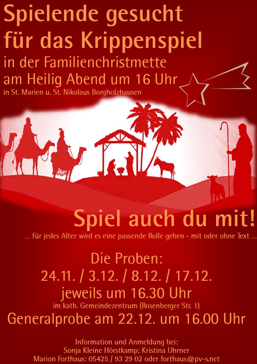 Herzlich laden wir alle Kinder ein, beim Krippenspiel in Borgholzhausen mitzumachen, das am Heiligabend um 16.00 Uhr während der Familien-Christmette in der Kirche St. Marien und St. Nikolaus aufgeführt wird. Für jedes Alter wird eine passende Rolle dabei sein – ob mit oder ohne Text. Die Proben finden an folgenden Tagen im Pfarrheim bzw. der Kirche statt: Mo 24.11.; Mi.3.12.; Mo. 8.12.; Mi. 17.11. jeweils um 16.30 Uhr. Und m Mo. 22.12. wird um 16.00 Uhr die Generalprobe stattfinden. Wer Interesse hat mitzuspielen oder weitere Informationen wünscht kann sich gern bei Marion Forthaus melden: 05425 / 93 29 02 oder forthaus@pv-s.net.
